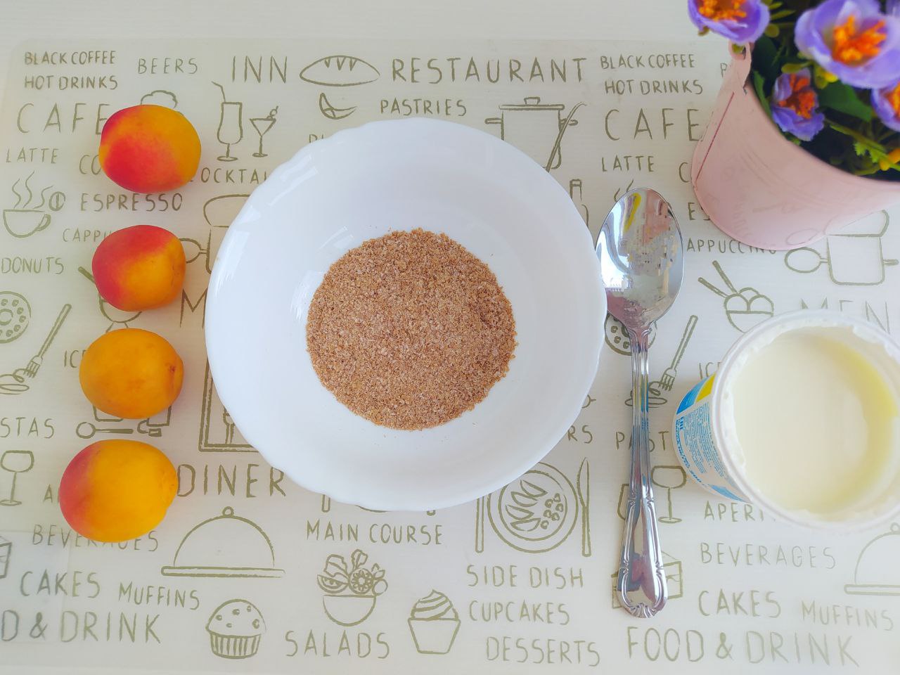 Клетчатку насыпать в глубокую тарелку, залить йогуртом, сверху выложить нарезанные абрикосы.