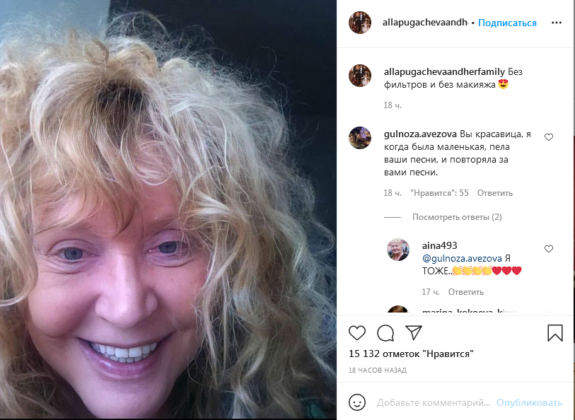 Пользователей Сети восхитил внешний вид артистки: «Вы – красотка!», «Ничего себе! И без макияжа прекрасна! Супер!», «Естественная красота!», «Примадонна! Слов нет! Легенда!», «Отлично выглядит Алла Борисовна. Так ей даже больше идет», «В 70 лет отлично», – писали комментаторы.