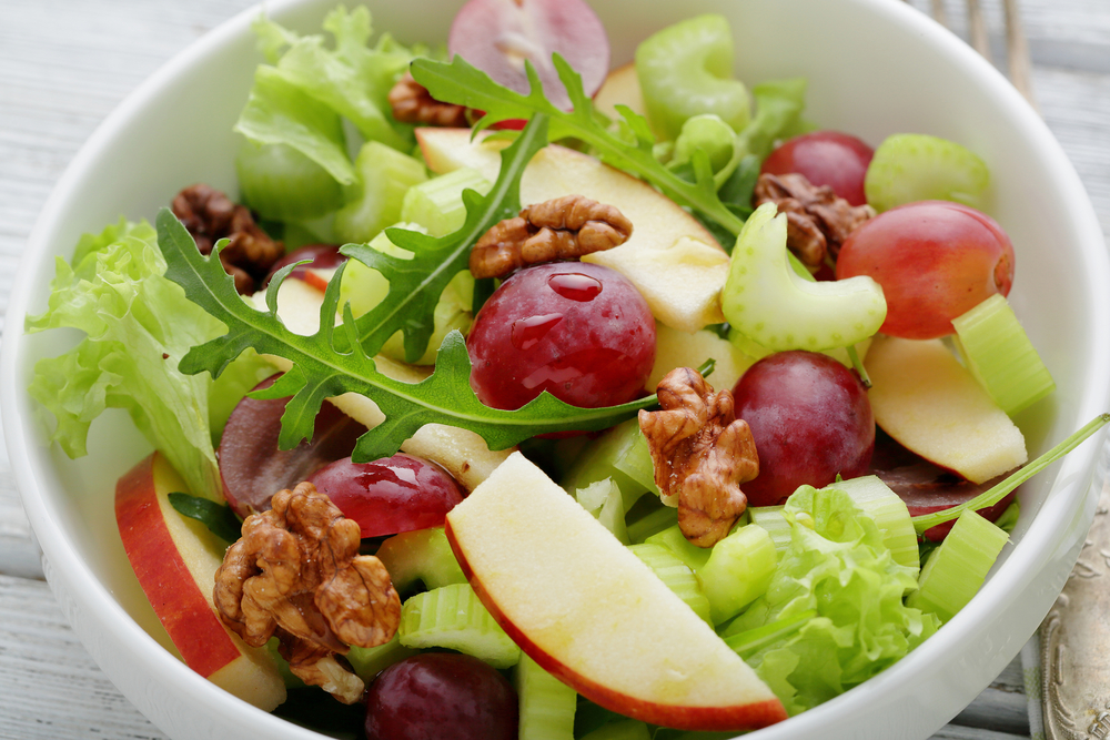 Аппетитный салат из яблок, винограда, сельдерея, орехов и зелени с йогуртовой заправкой. Понадобится: грецкие орехи, йогурт, зелень петрушки, жидкий мёд, тертая цедра половины лимона, 2 яблока, сельдерей, листья салата, лимонный сок.