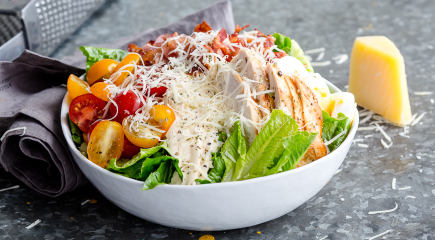 Понадобится: куриное филе, салатные листья, помидоры черри, 2 яйца, пармезан, горчица, оливковое масло, сухарики, винный уксус, лимонный сок.