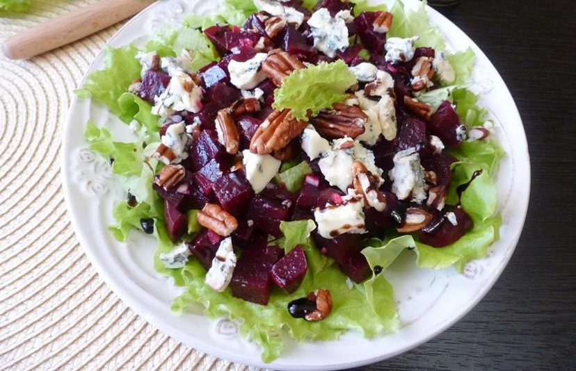 Готовим салат из рукколы, запеченной свеклы, авокадо, грецких орехов и голубого сыра. Понадобится: свекла, авокадо, руккола, сыр, грецкие орехи, оливковое масло, лимонный сок.