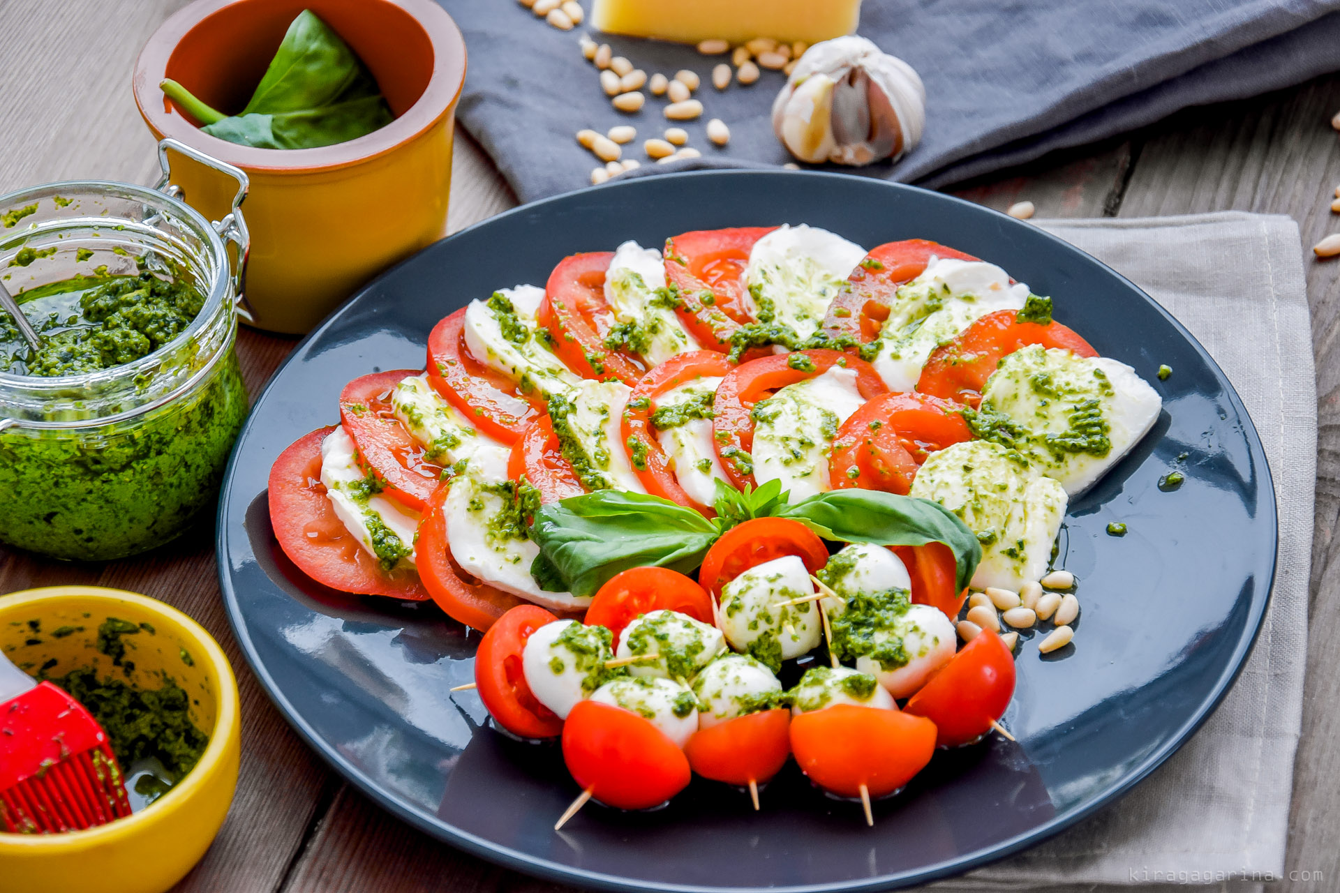 Этот итальянский салат – самая простая и вкусная летняя закуска. Выбирай для «Капрезе» только спелые и сладкие помидоры. Понадобится: помидоры – 2 шт., моцарелла, базилик, оливковое масло.