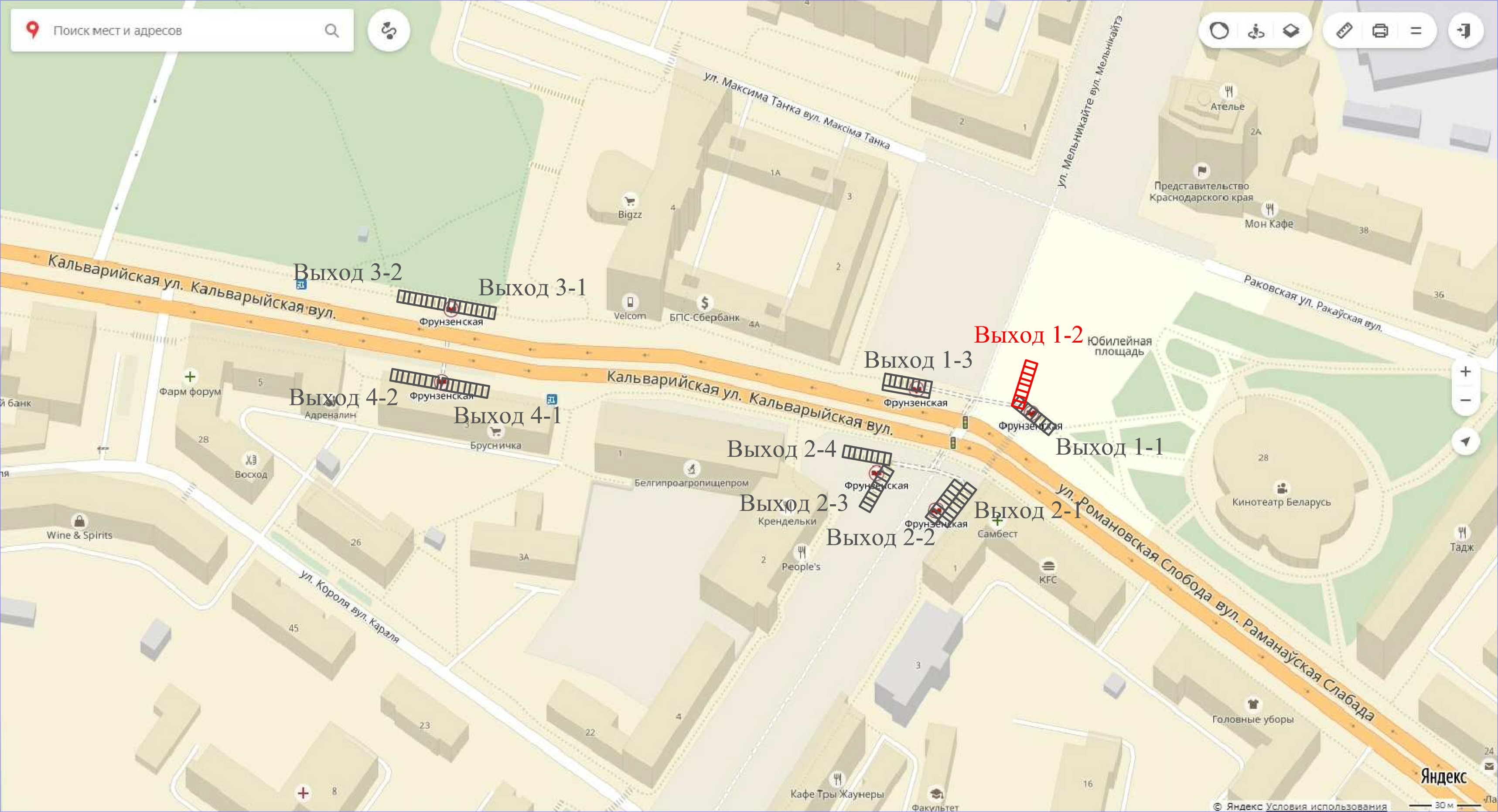 В сообщении пресс-службы говорится, что будет полностью закрыт выход №1-2 (один из выходов в сторону кинотеатра «Беларусь», показан на карте) с 17 мая. Он вновь начнет действовать 1 июня текущего года.