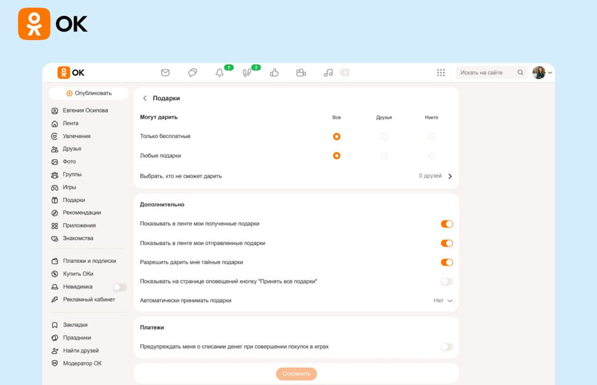 Сервис виртуальных подарков – один из самых массовых в ОК. Ежедневно миллионы пользователей отправляют подарки к праздникам или просто без повода. Если подарок принят, он отображается на фотографии пользователя, а также в его ленте. Подарками в ОК можно обмениваться бесплатно или же приобретать их за внутреннюю валюту соцсети. ОК активно работают над тем, чтобы сервис не только оставался популярным и увеличивал свою аудиторию, но и был комфортным для всех пользователей – в том числе тех, кто хотел бы ограничить нежелательную активность на своей странице в соцсети.