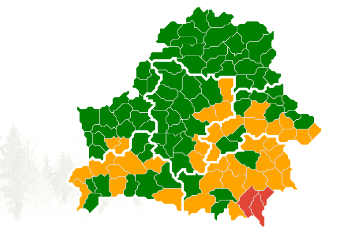 По состоянию на 15:00 14 июля, согласно данным интерактивной карты, ограничения действуют в 39 районах Беларуси, запреты – в 3 районах (все – на юго-востоке Гродненской области).