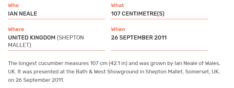 Расти калинковичским огурцам надо усердно. Самый длинный огурец, зафиксированный в Книге рекордов Гиннеса, достиг 107 см. Его вырастили в Уэльсе (Великобритания). Рекорд датируется 2011 годом.