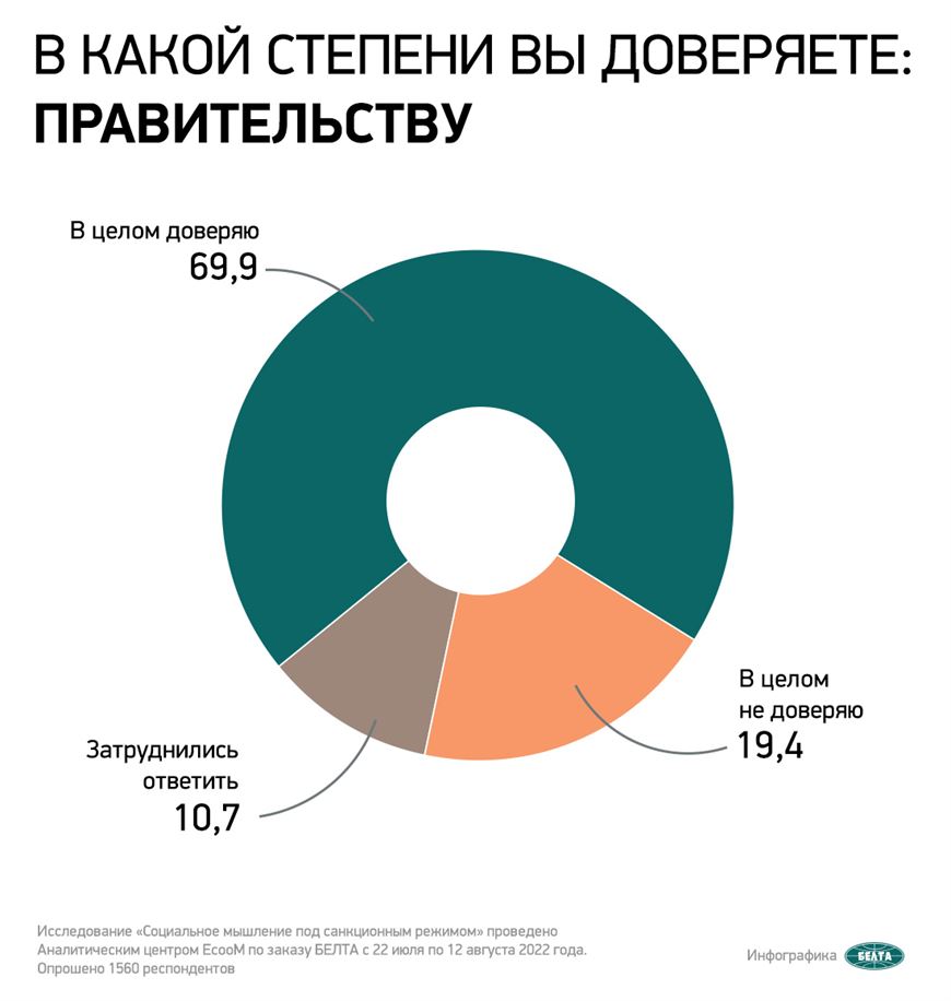 На вопрос «В какой степени вы доверяете правительству?» 69,9% белорусов ответили «В целом доверяю», не доверяет 19,4%, затруднились ответить 10,7% граждан.