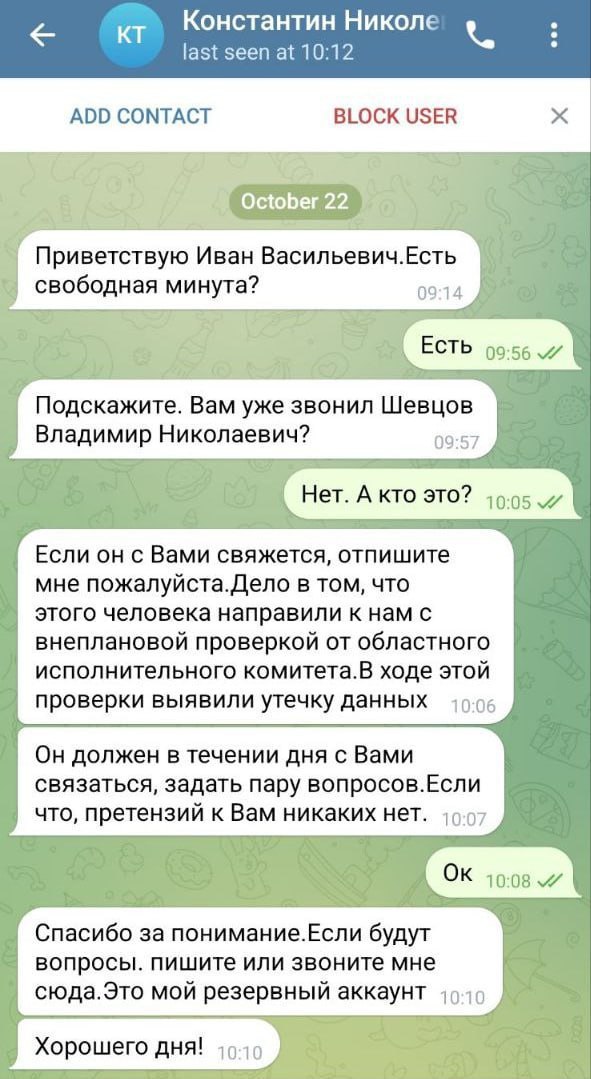 В сообщениях отмечалась необходимость предоставить пояснения по якобы выявленным фактам утечки данных «проверяющему лицу» из Могилевского облисполкома. Отправители утверждают, что данное лицо выбыло на внеплановую проверку в Горки.