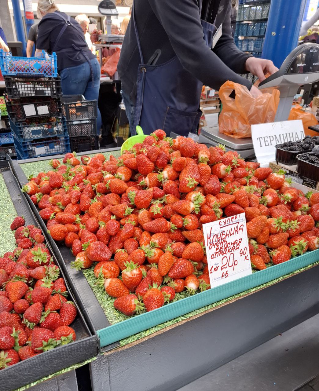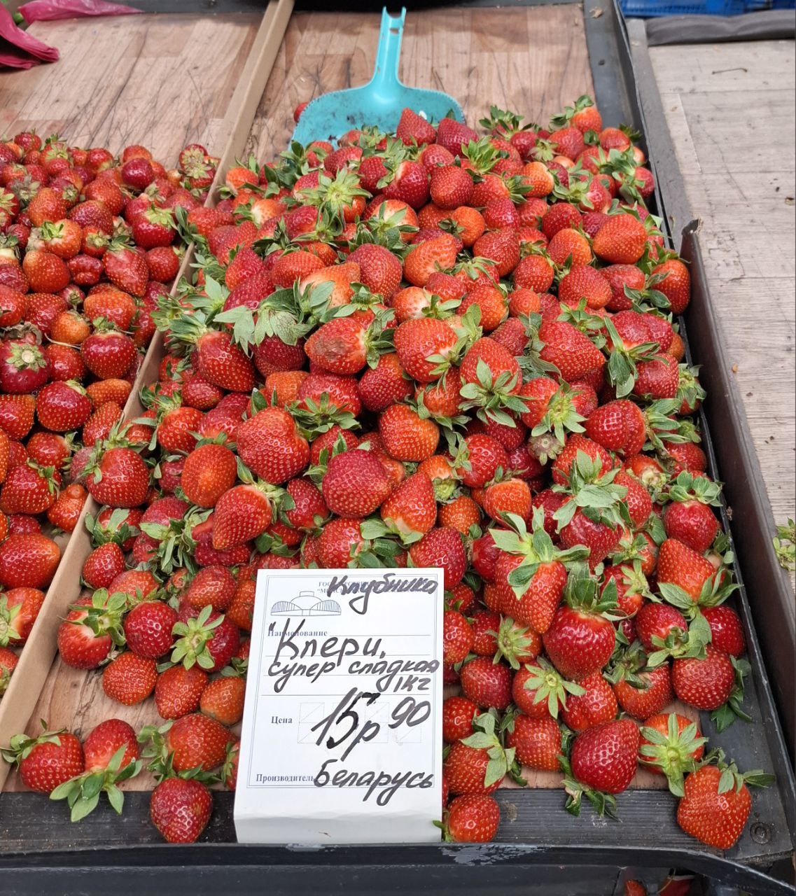 «Сорт у меня секретный (смеется), вот уже почти все ящики продал!» – пояснил фермер, намекая на то, что его клубника пользуется спросом, несмотря на высокую цену.