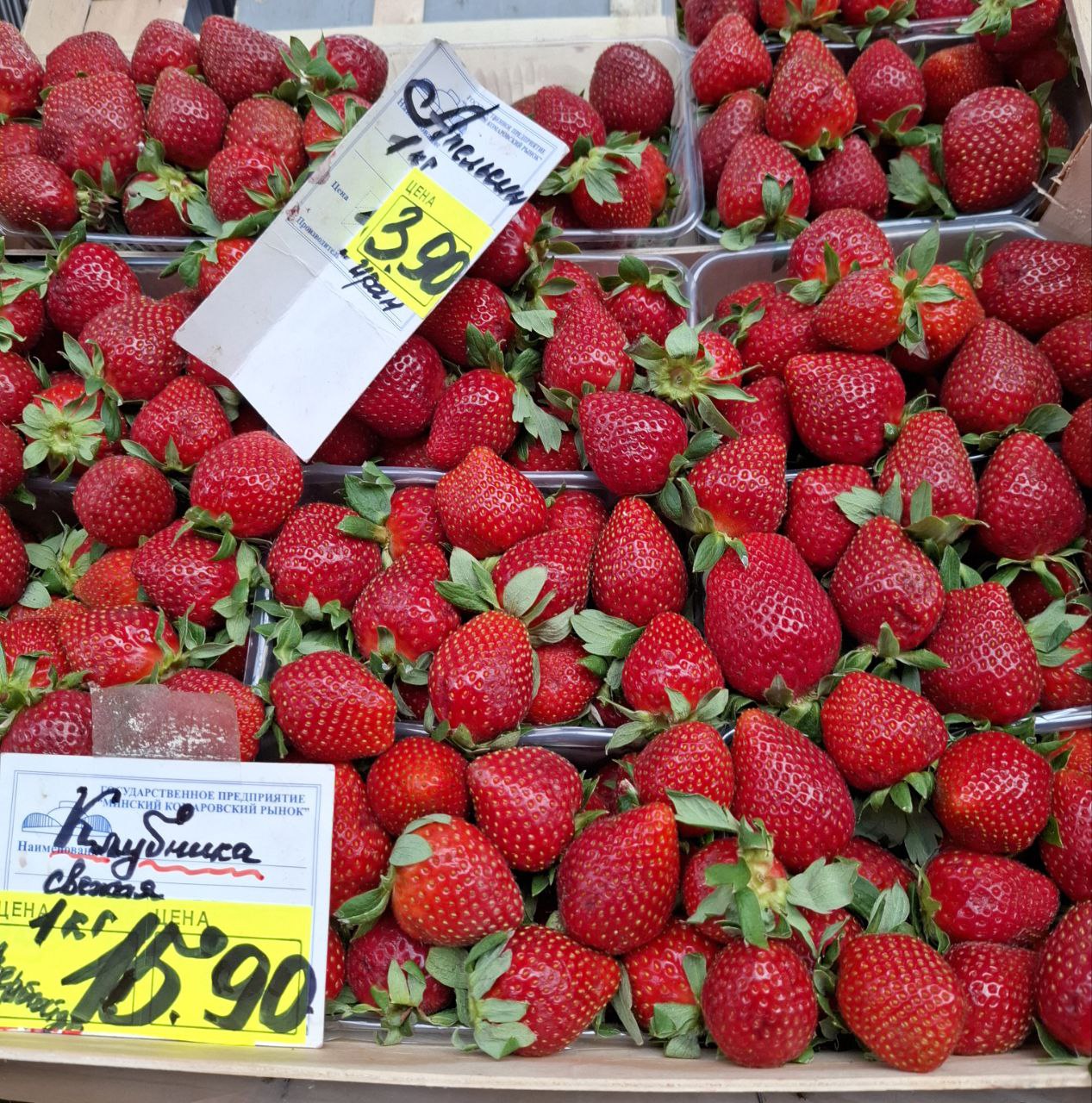 Рынок гудит, неудивительно – солнечный выходной день! Направляемся к рядам с клубникой. В основном представлена Брестская область – Лунинец, Дрогичин, Пинск, Береза, есть прилавки с ягодами из Сморгони Гродненской области. В наличии также клубника из Греции и Азербайджана. Цена очень разная: от 11,90 руб./кг до 40 руб./кг.