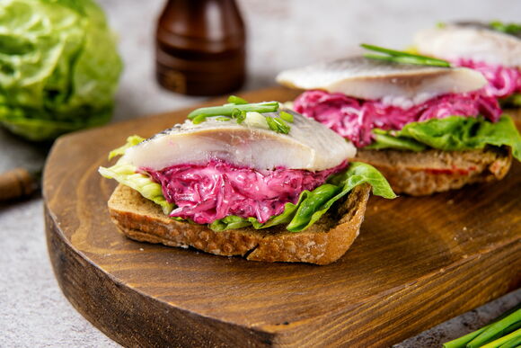 Как готовить: натрите на крупной терке вареную свеклу, заправьте майонезом. Филе сельди нарежьте небольшими кусочками. Выложите на ломтики хлеба листья салата, свекольную начинку и сельдь.