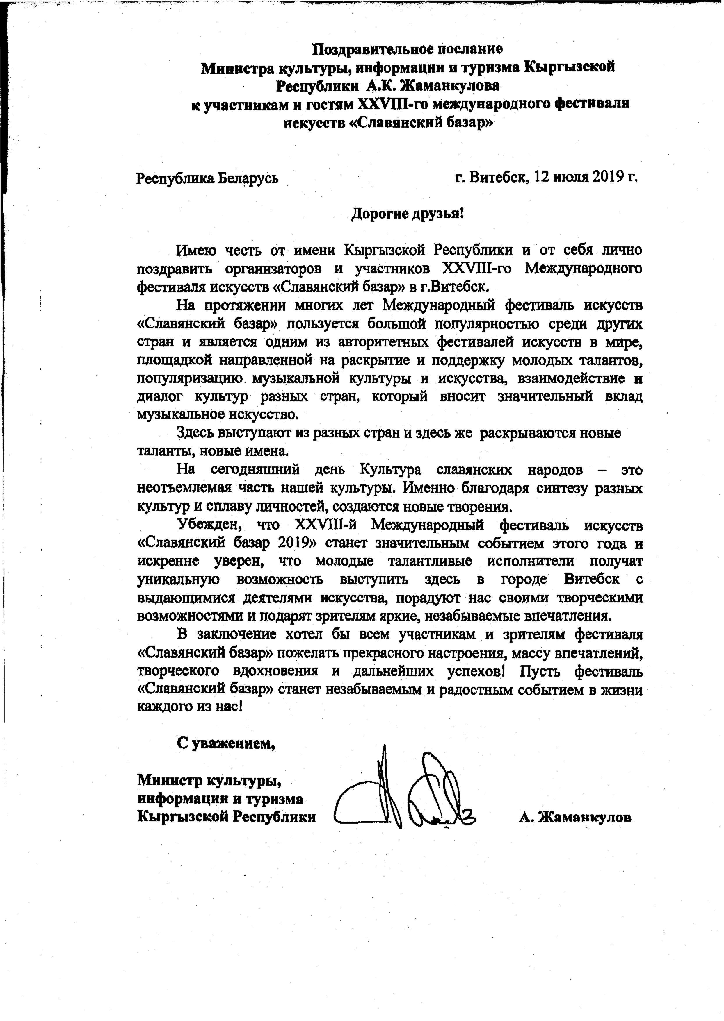 Министр культуры, информации и туризма Кыргызстана Азамат Жаманкулов отметил, что на протяжении многих лет «Славянский базар» пользуется большой популярностью среди других стран и является одним из авторитетных фестивалей искусств в мире, площадкой направленной на раскрытие и поддержку молодых талантов, взаимодействие и диалог культур разных стран. Вносит значительный вклад музыкальное искусство, а именно благодаря синтезу разных культур и сплаву личностей, создаются новые творения.