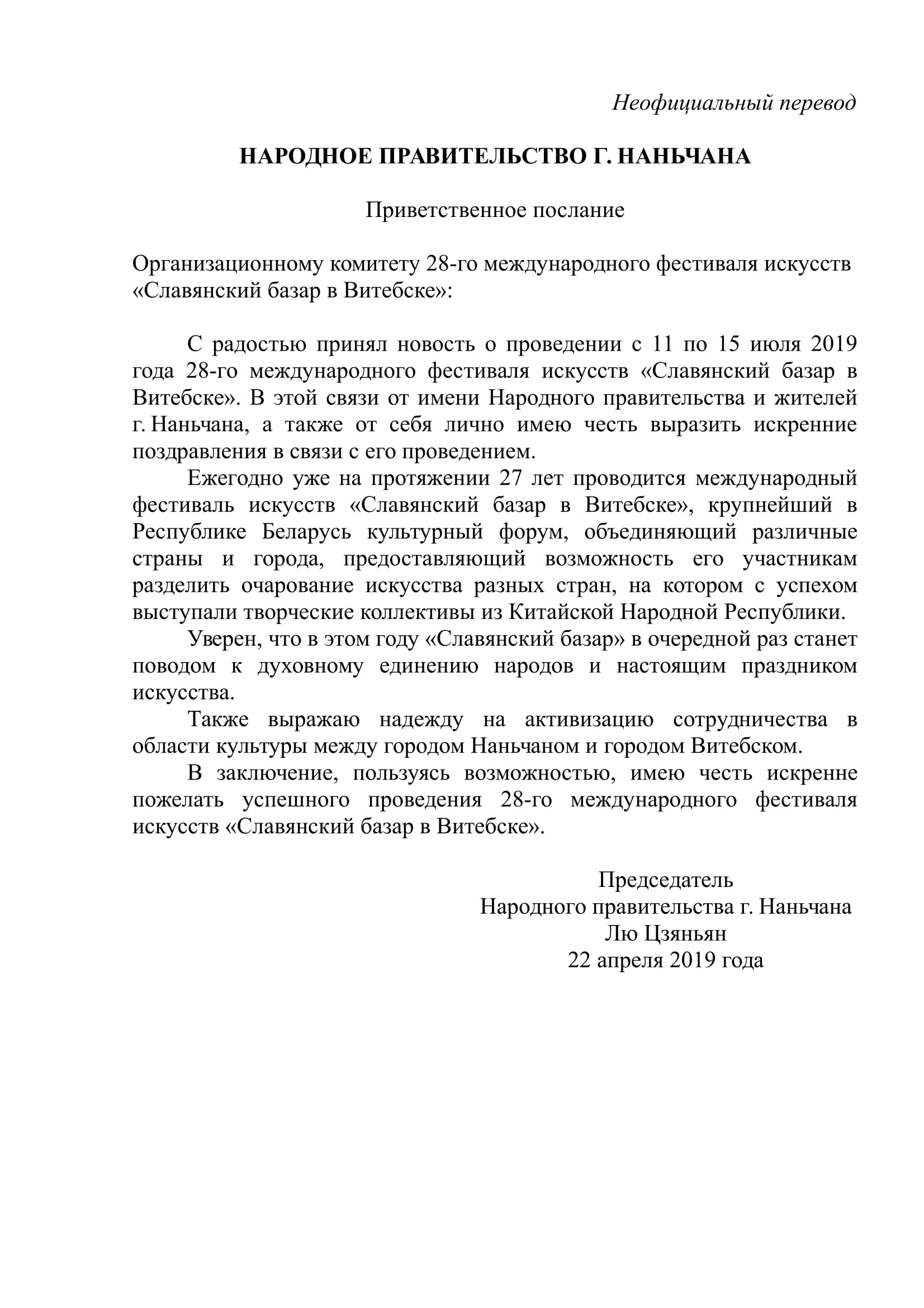 Председатель народного правительства г. Наньчана Лю Цзяньян выразил уверенность, что в этом году «Славянский базар» в очередной раз станет поводом к духовному единению народов и настоящим праздником искусства.