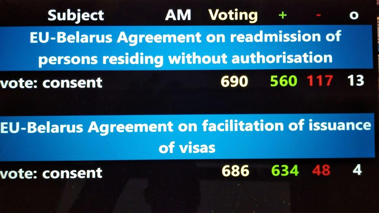 Европарламент подавляющим большинством голосов поддержал ратификацию соглашений об упрощении визового режима и реадмиссии между Республикой Беларусь и Евросоюзом. Об этом из Брюсселя передаёт шеф Европейского бюро ОНТ Руслан Поддубский.