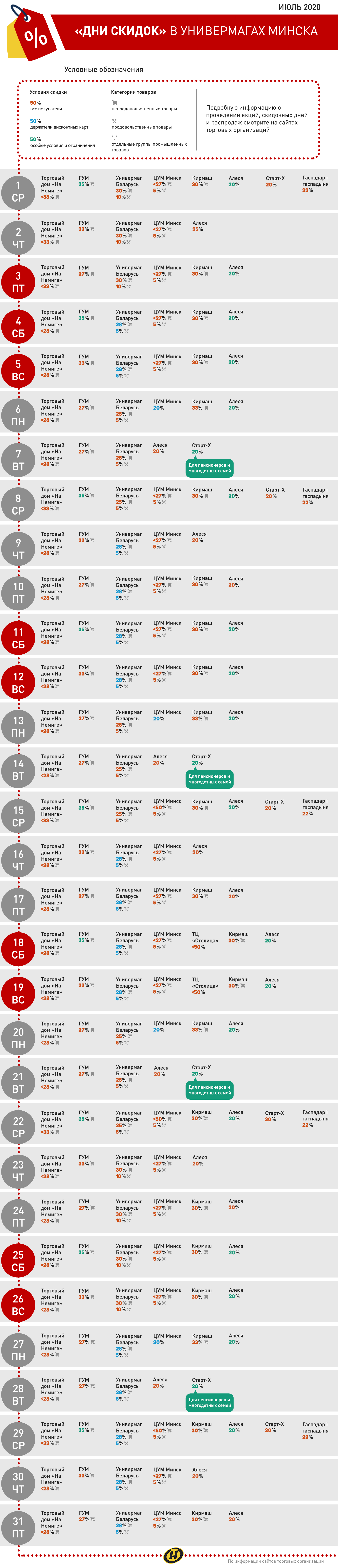 В июле в столичных универмагах продолжается акция «День скидок». Размер дисконта будет составлять от 5% до 50%. Чтобы Вам было проще выбрать наиболее выгодные предложения, ONT.BY подготовил удобную инфографику.