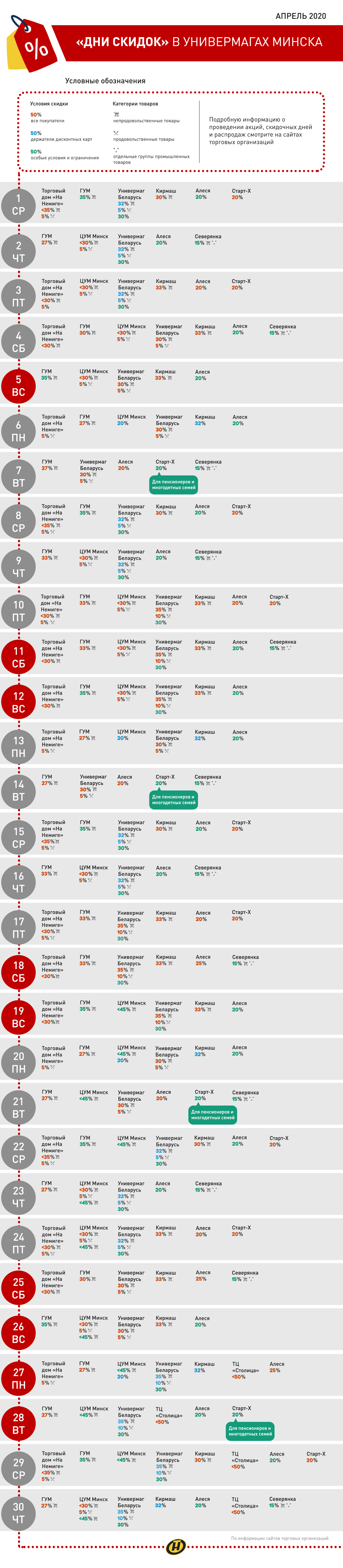 Столичные универмаги не перестают радовать покупателей. В апреле продолжается акция «День скидок». Размер дисконта будет составлять от 5% до 10% на продовольственные товары и от 15% до 50% на непродовольственные. Чтобы Вам было проще выбрать наиболее выгодные предложения и определиться с местом покупок, ONT.BY подготовил удобную инфографику.