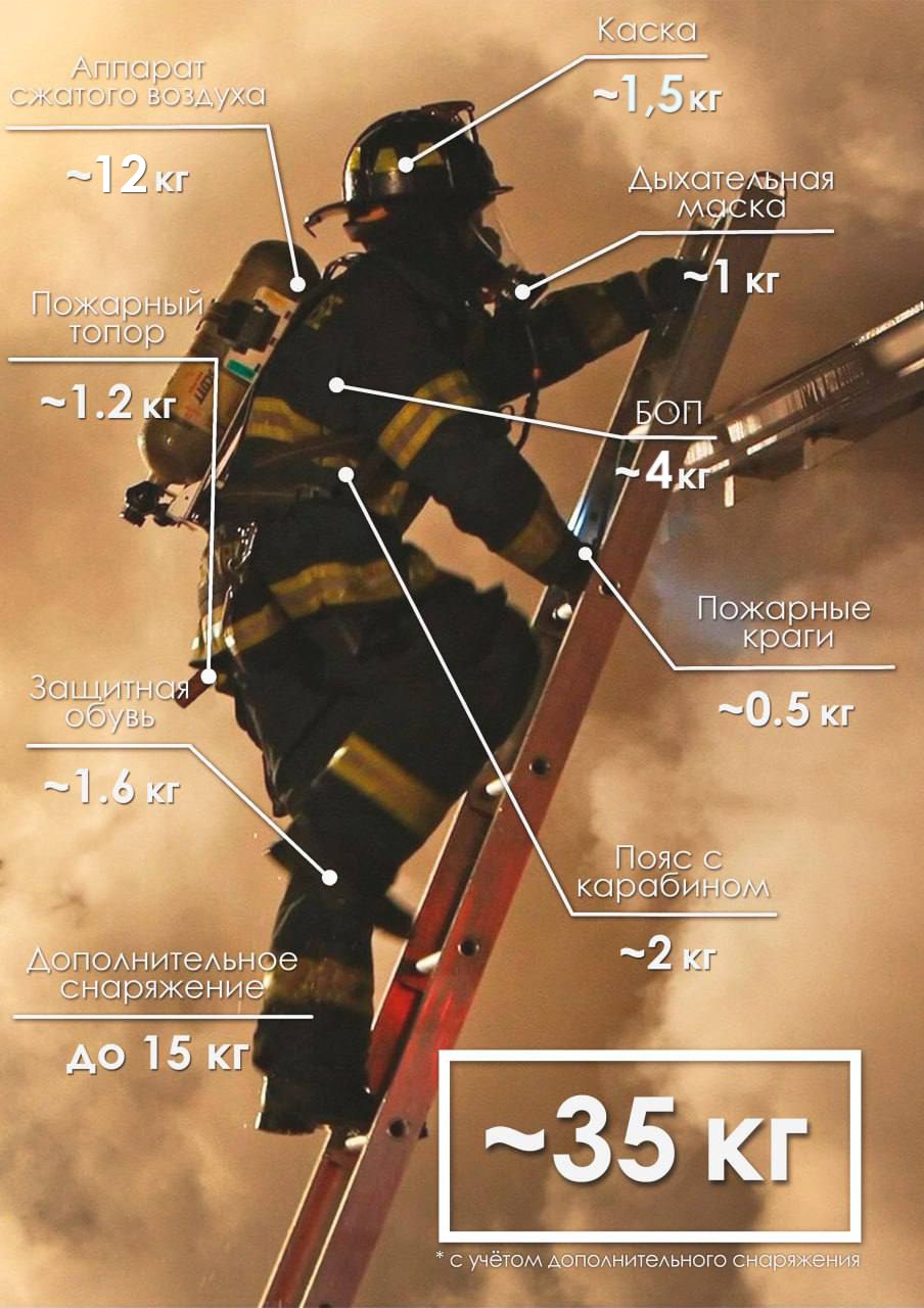 В нее входят: аппарат сжатого воздуха (около 12 кг), каска (около 1,5 кг), дыхательная маска (около 1 кг), боевая одежда пожарного-спасателя (около 4 кг), пожарные краги (около 0,5 кг), пояс с карабином (около 2 кг), защитная обувь (около 1,6 кг), пожарный топор (около 1,2 кг).