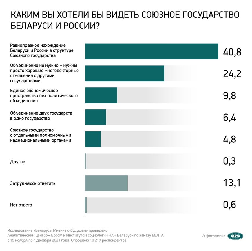 40,8% белорусов проголосовали за равноправные отношения, 24,2% граждан ответили, что объединение не нужно – нужны просто хорошие многовекторные отношения с другими государствами. За объединение двух государств в одно проголосовали 6,4%.