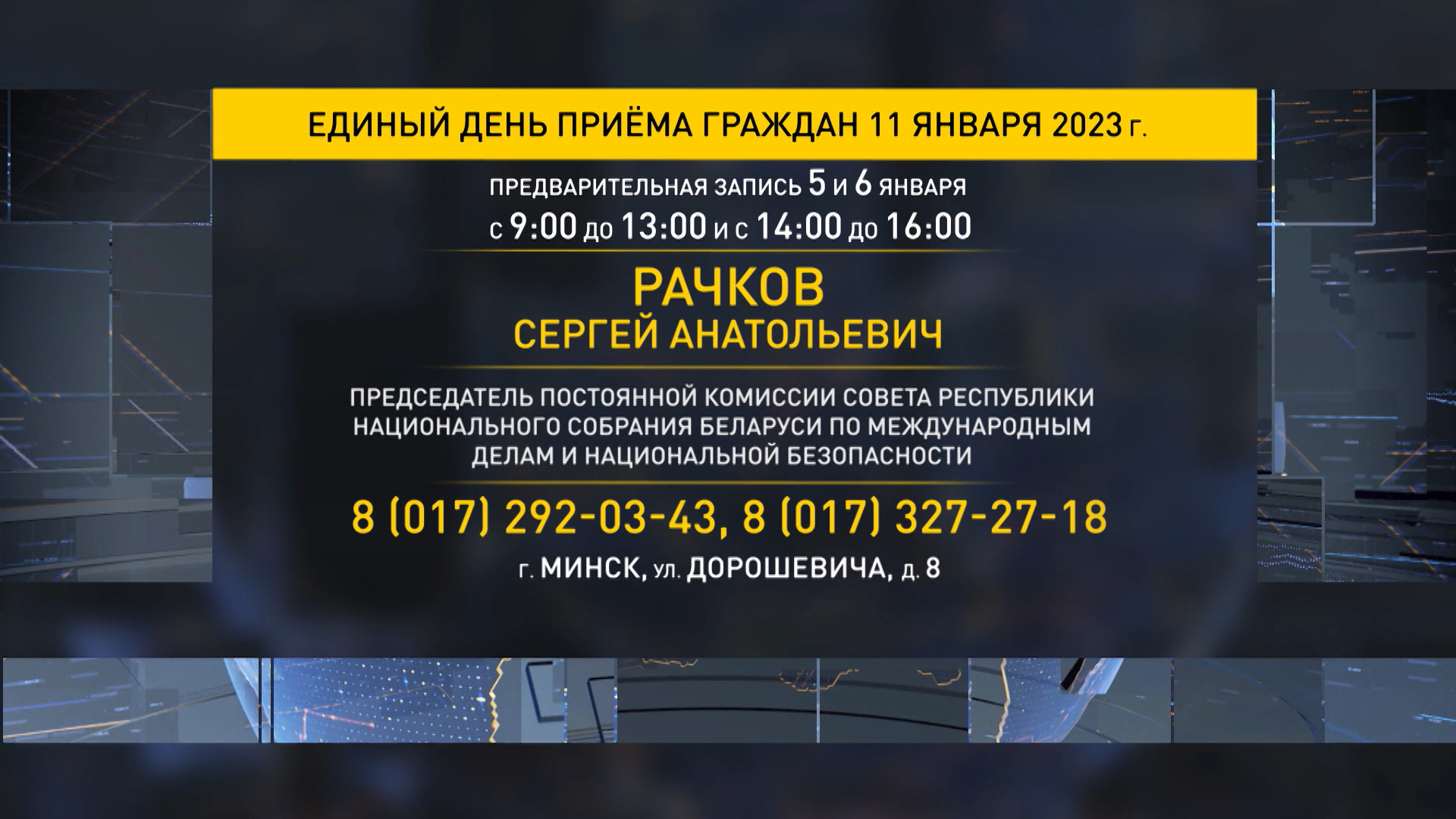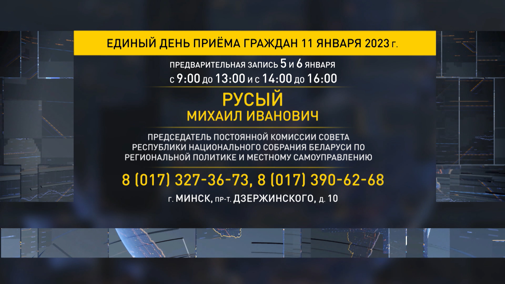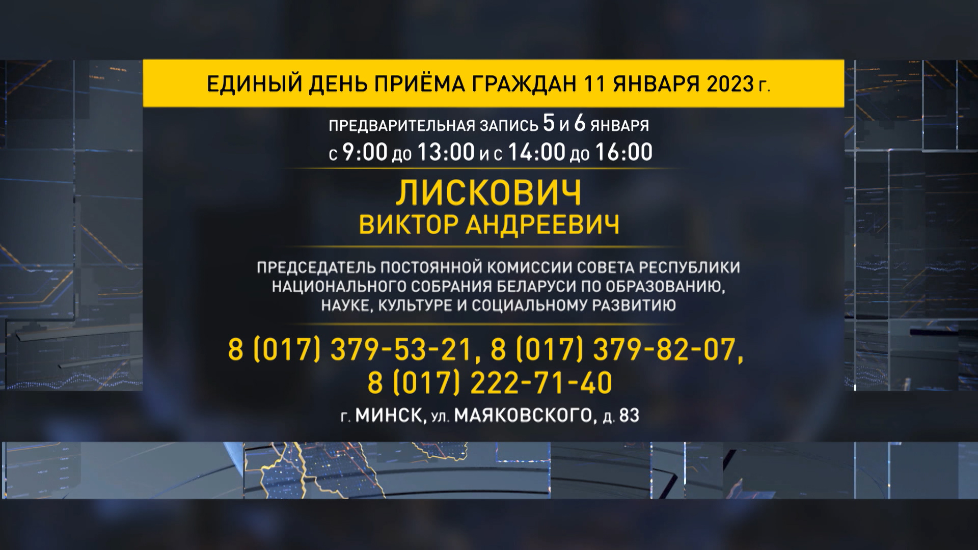Также приемы состоятся у председателя Постоянной комиссии по образованию, науке, культуре и социальному развитию Виктора Лисковича и председателя по региональной политике и местному самоуправлению Михаила Русого – он встретится с людьми в Администрации Московского района.