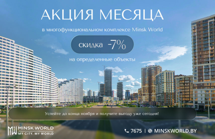 Сезон выгодных цен в известном многофункциональном комплексе столицы. До конца декабря 2025 года для покупателей всех видов недвижимости в комплексе «Минск-Мир» действует специальное предложение: при полной оплате в течение 7 календарных дней – скидка 7%!