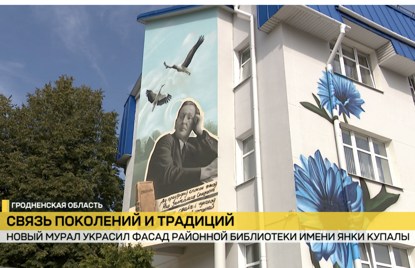 Новый объект искусства презентовали ярко: с песнями и танцами. Огромный мурал украсил фасад районной библиотеки имени Янки Купалы. Автором уличного шедевра стал минский художник Константин Пахомчик. К разработке эскиза подошел ответственно. На стене здания теперь увековечен образ белорусского классика. Рядом с ним – знаменитый сборник стихов «Спадчына» и главные символы Беларуси – белоснежные аисты. Такой мурал в городе не первый. Арт-проект «Традыцыi дзеля будучынi» Беларусбанк реализуется уже несколько лет и раскрашивает белорусские города яркими, памятными картинами. Главная задача – популяризировать достояние отечественной письменной культуры и сохранить духовные традиции Беларуси.