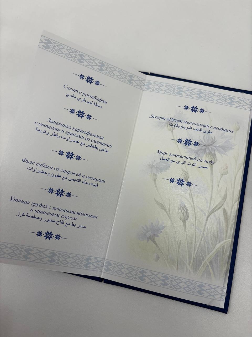 На десерт на стол подавали меренговый рулет с ягодами. Также Хайсама бен Тарека Аль Саида угощали клюквенным морсом на меду.