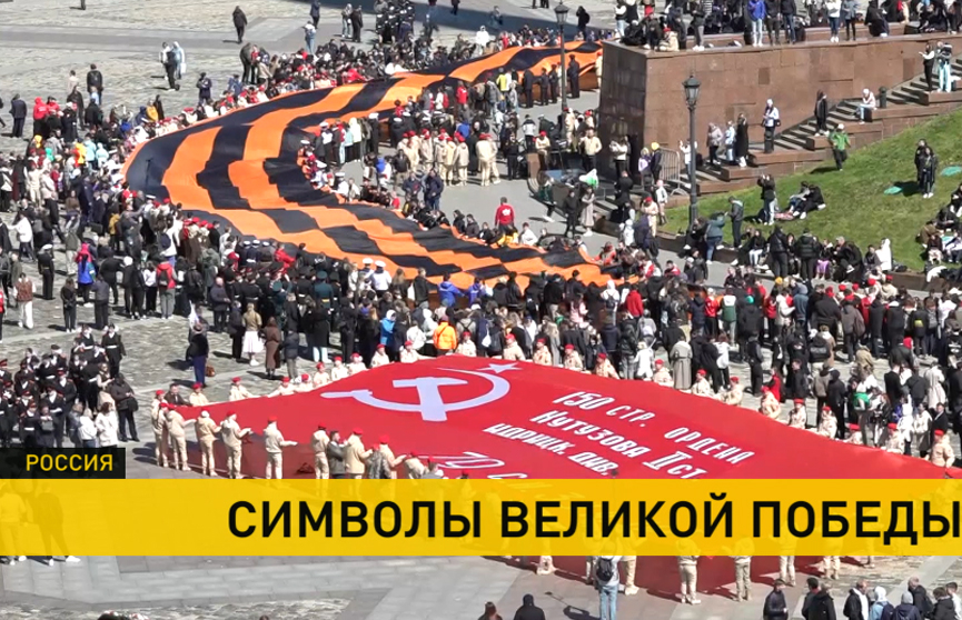 Церемония у московского Музея победы на Поклонной горе под «Священную войну» и Венский вальс дала старт акции международного проекта «Символы Великой Победы». Помимо Знамени, развернули и 300-метровую Георгиевскую ленту.