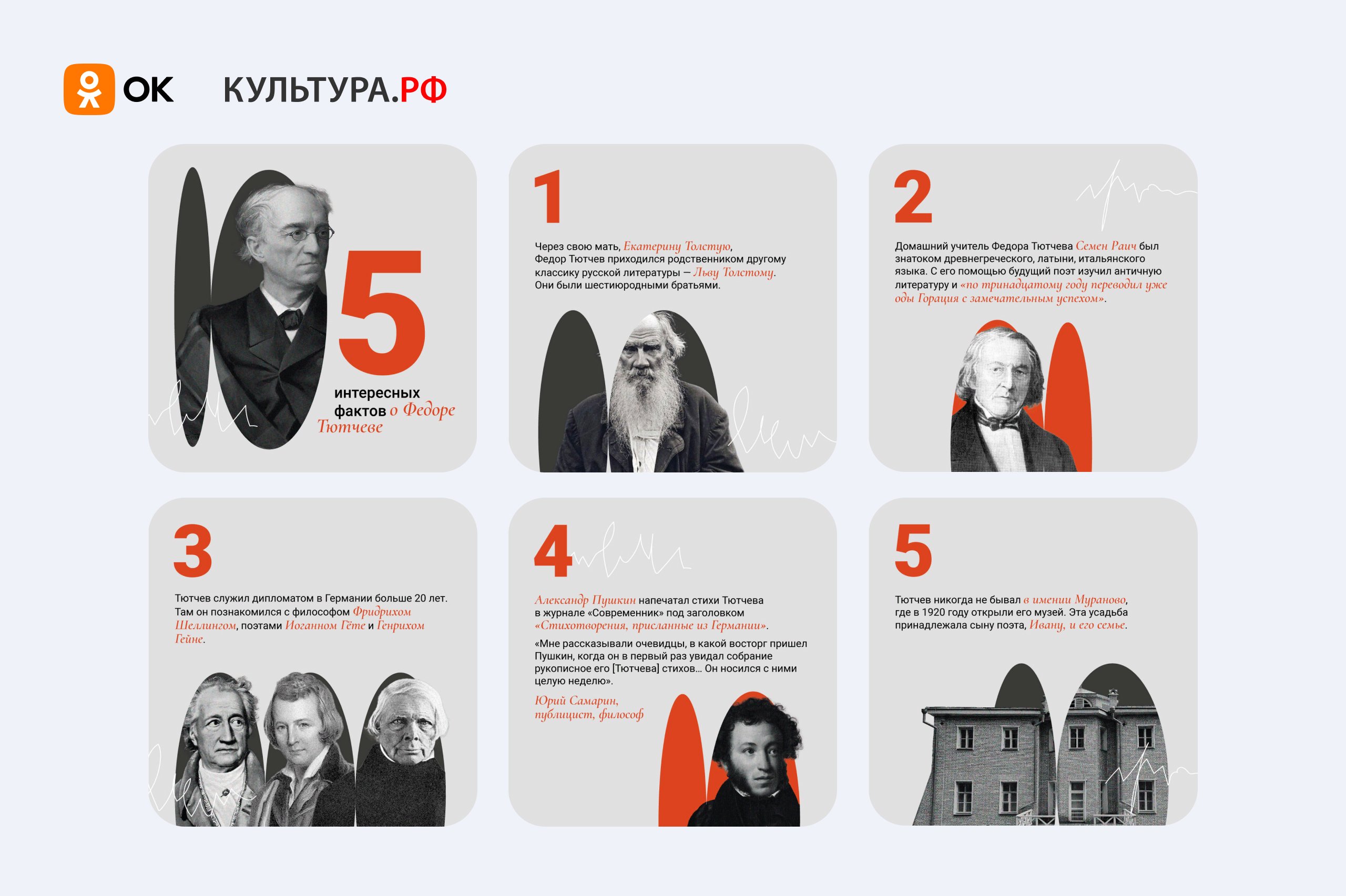 5 декабря в группе Культура РФ пользователи ОК могут пройти тест и проверить, насколько хорошо они знают произведения Тютчева. В тестах нужно понять, принадлежат слова Федору Ивановичу или другому автору. Помимо этого, в группе выпущены плейлисты с романсами автора, а также карточки с интересными фактами о поэте. Например, пользователям расскажут, сколько лет Тютчев был дипломатом и кем ему приходился Лев Николаевич Толстой.