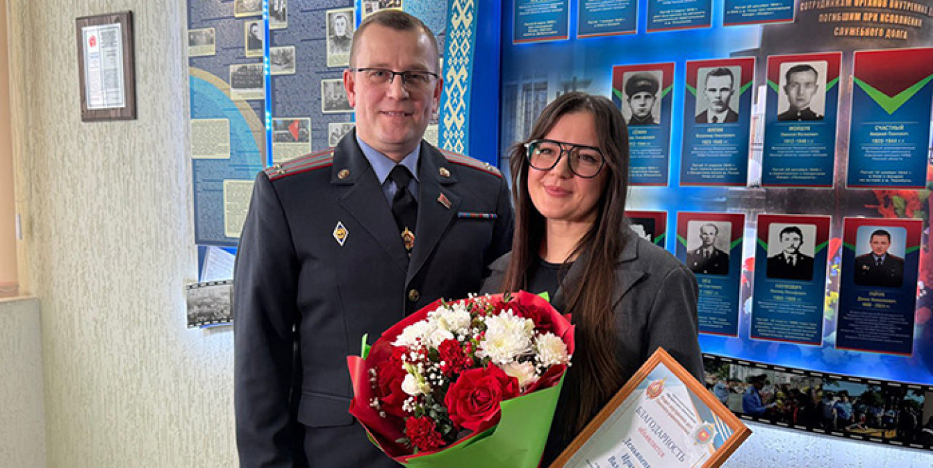 Начальник Пинского РОВД Андрей Головач в торжественной обстановке вручил Ирине Демьяненко благодарность офицерского собрания, цветы и материальное вознаграждение.
