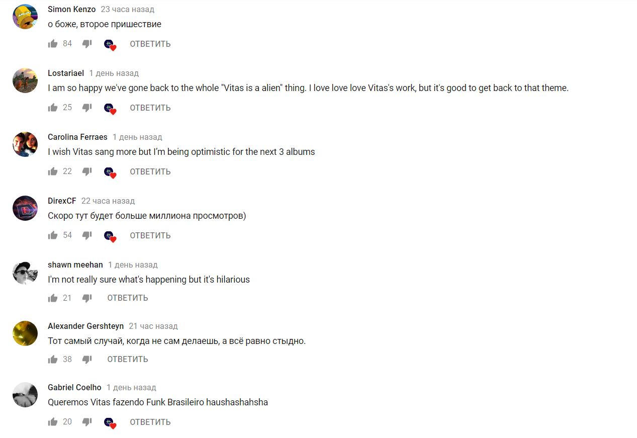В своей манере Витас в клипе издаёт необычные «курлыкающие» звуки. В комментариях пользователи отметили, что артист прилично поправился, да и костюм уже не так идёт, как в былые времена. Последний альбом Виталия Грачёва (Витаса) вышел в 2016 году.