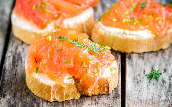 С рыбой. 80 г филе слабосоленой семги без костей пропустите через мясорубку или измельчите в блендере. Разотрите рыбную массу со сливочным маслом (100 г) и рубленной зеленью (2 ст. л.). Намазываем на порционные кусочки нарезанного хлеба и подаем охлажденными.