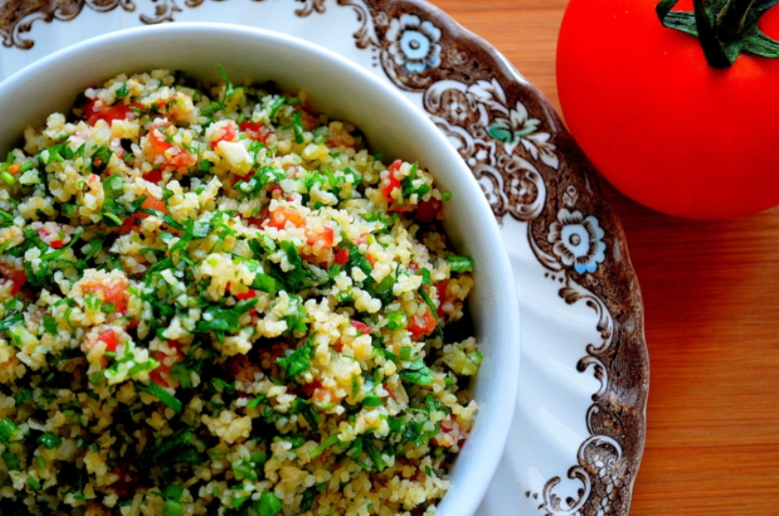 Как готовить: 2-3 ст. л. булгура залейте кипятком, добавьте щепотку соли и оставьте под крышкой примерно на 1 час. Затем слейте лишнюю воду. Мелко порубите пучок петрушки, кинзы, зеленого лука и 10 листиков мяты. Нарежьте мелкими кубиками 2 средних помидора. Соедините булгур, зелень и помидоры, полейте соком одного лимона, посолите, поперчите по вкусу и заправьте оливковым маслом. Подавайте к столу охлажденным.