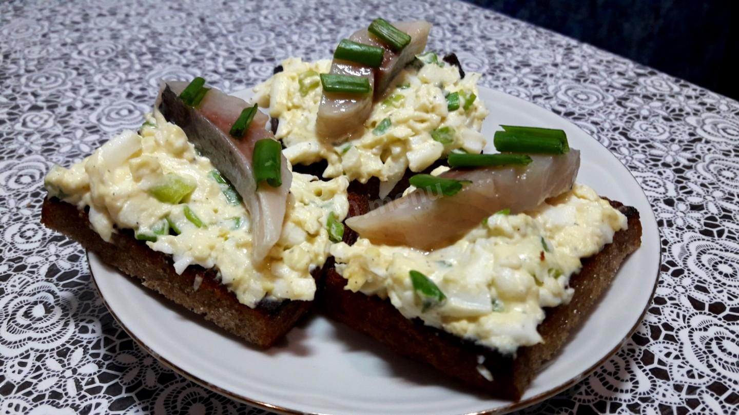 С сельдью. 4 кусочка черного хлеба разрежьте на части и немного обжарьте с двух сторон, остудите. 4 сваренных вкрутую яйца натрите на крупной терке и смешайте с мелкопорезанным зеленым луком (небольшой пучок), заправьте 3 ст. л. майонеза и перемешайте. На ломтики хлеба положите примерно по 1 ст. л. яичной массы, сверху выложите ломтики сельди, очищенной от костей и нарезанной крупными кусками. Украсьте бутерброды зеленым луком.