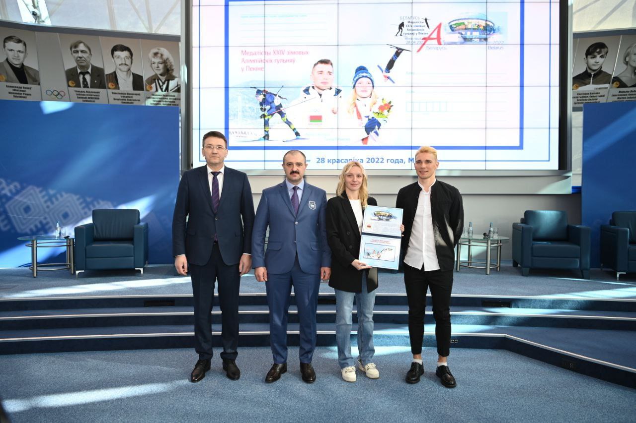 Конверт с маркой «Медалисты XXIV зимних Олимпийских игр в Пекине» был выпущен 20 апреля 2022 года Министерством связи и информатизации Республики Беларусь. Это совместный проект Минсвязи и Национального олимпийского комитета Беларуси. Дизайн конверта и спецштемпеля разработала Елена Медведь.