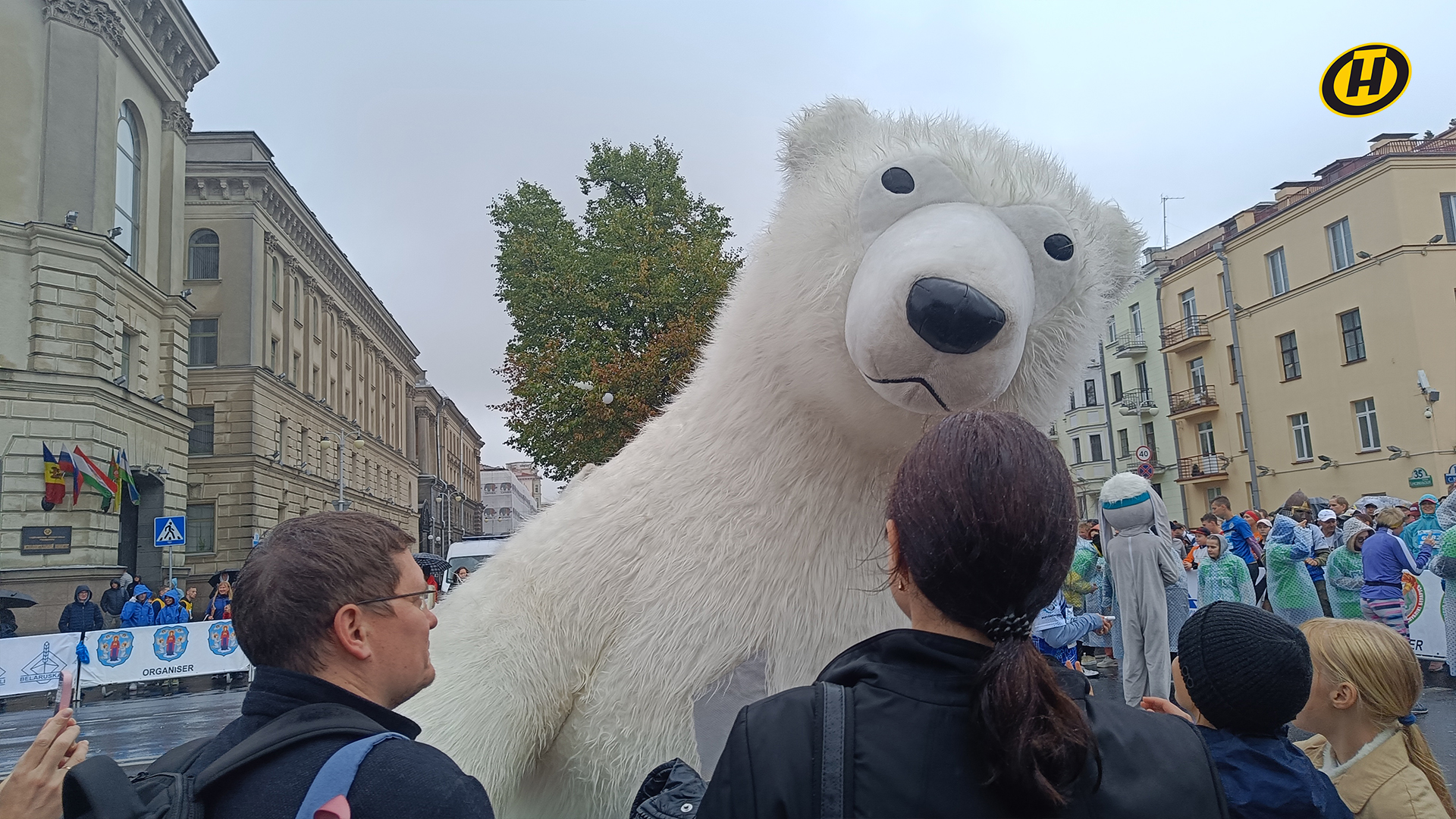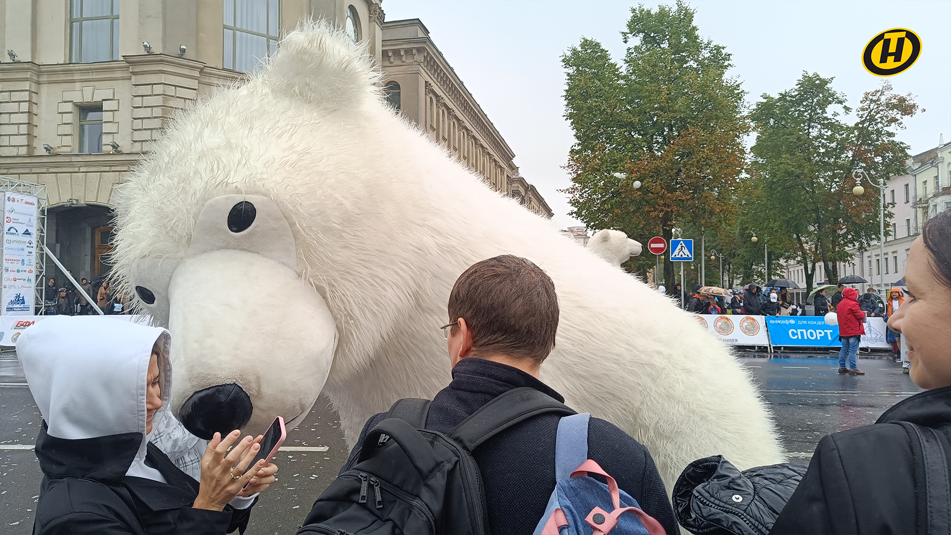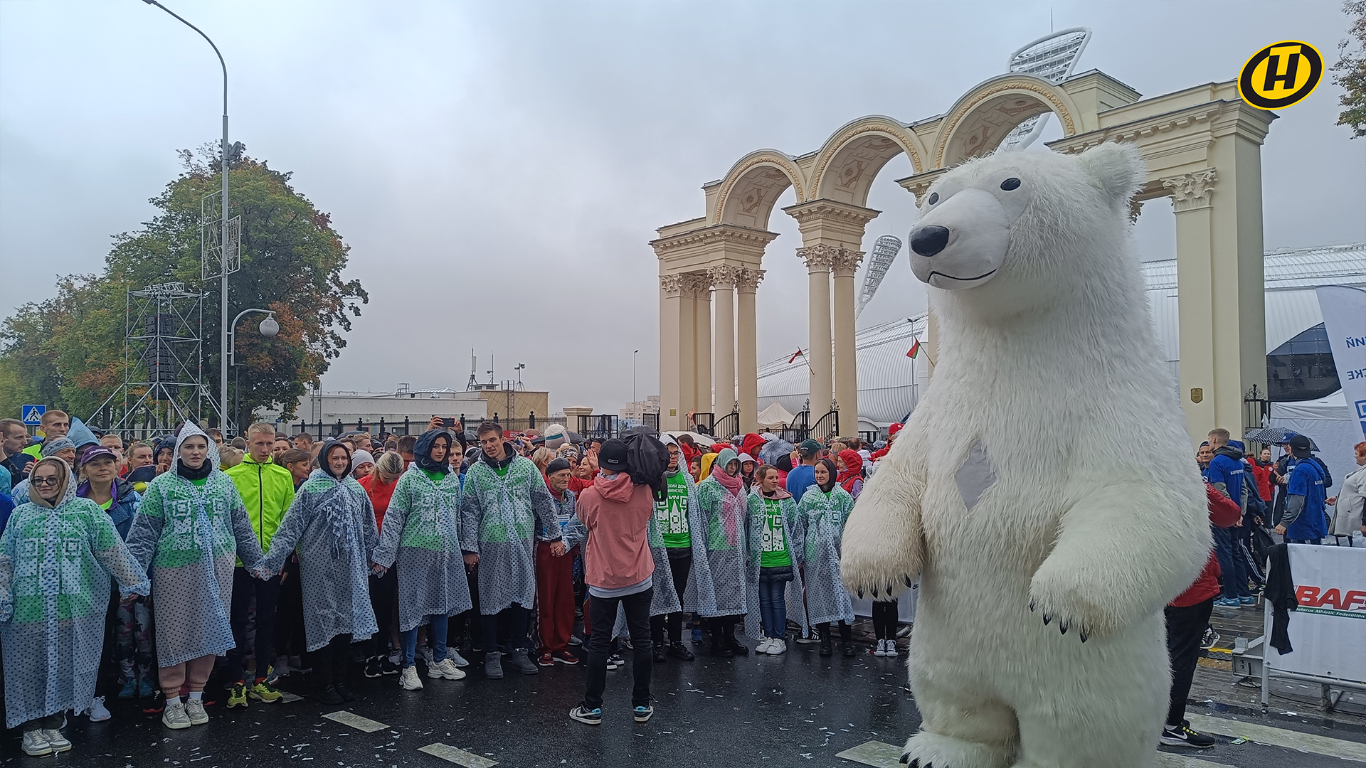Перед каждым забегом с участниками проводили зарядку под зажигательную музыку. Помогали бегунам разминаться и белые медведи. Большие плюшевые мишки создавали настроение и поддерживали перед стартом.