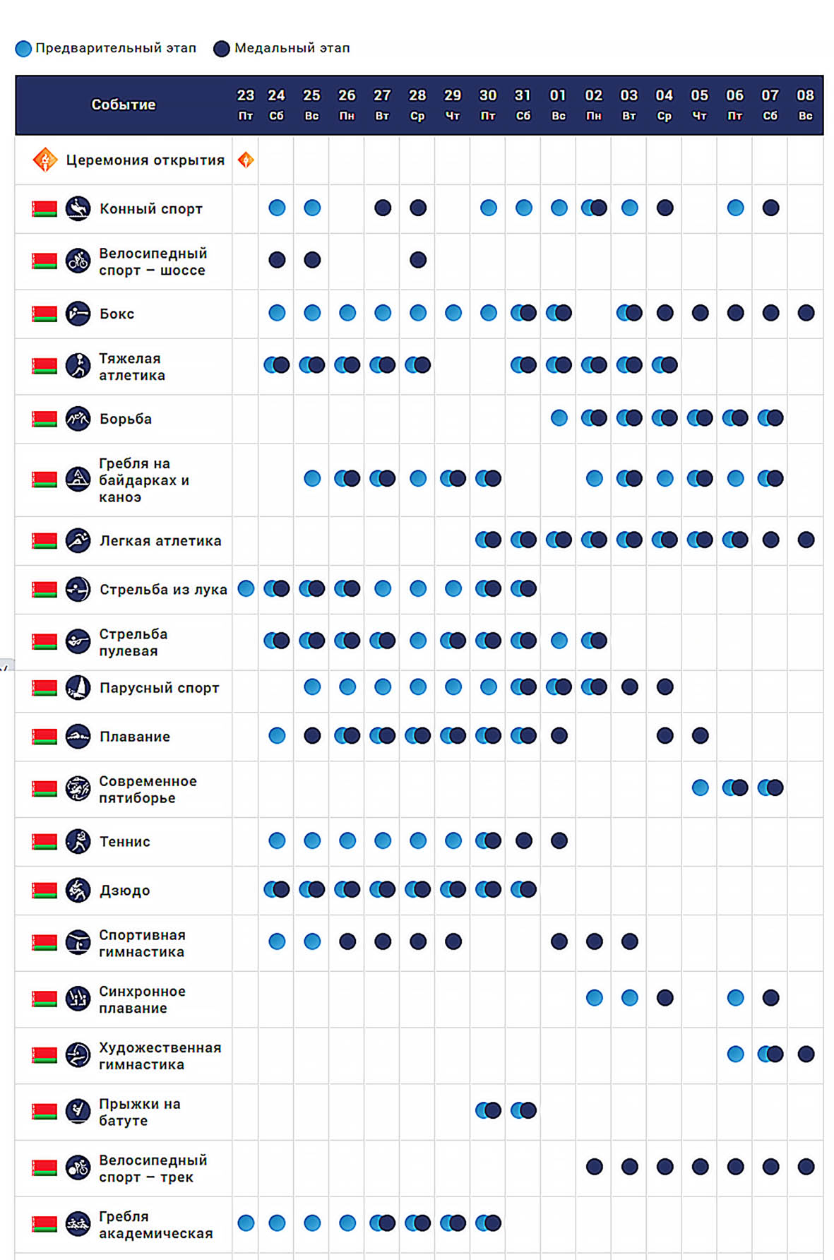 23 июля в Токио откроются Летние Игры XXXII Олимпиады. Беларусь представят 108 спортсменов, которые поборются за медали в 20 видах спорта. НОК Беларуси опубликовал расписание выступлений белорусских атлетов.