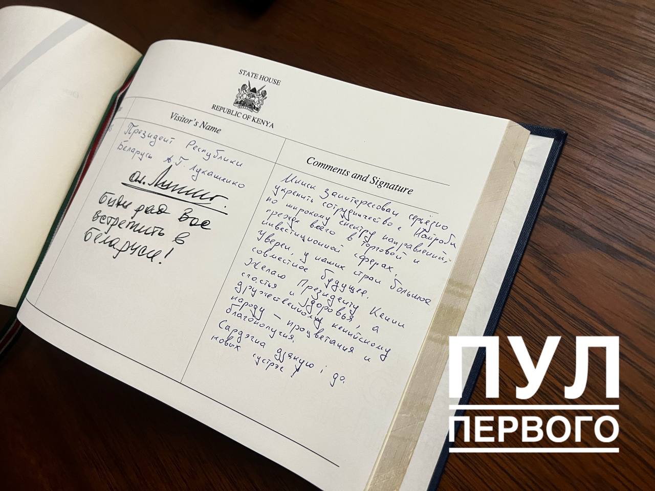 Президент Республики Беларусь Александр Лукашенко оставил запись в книге Почетных гостей Кении во время рабочего визита в вышеуказанную африканскую страну. Об этом информирует Telegram-канал «Пул Первого».