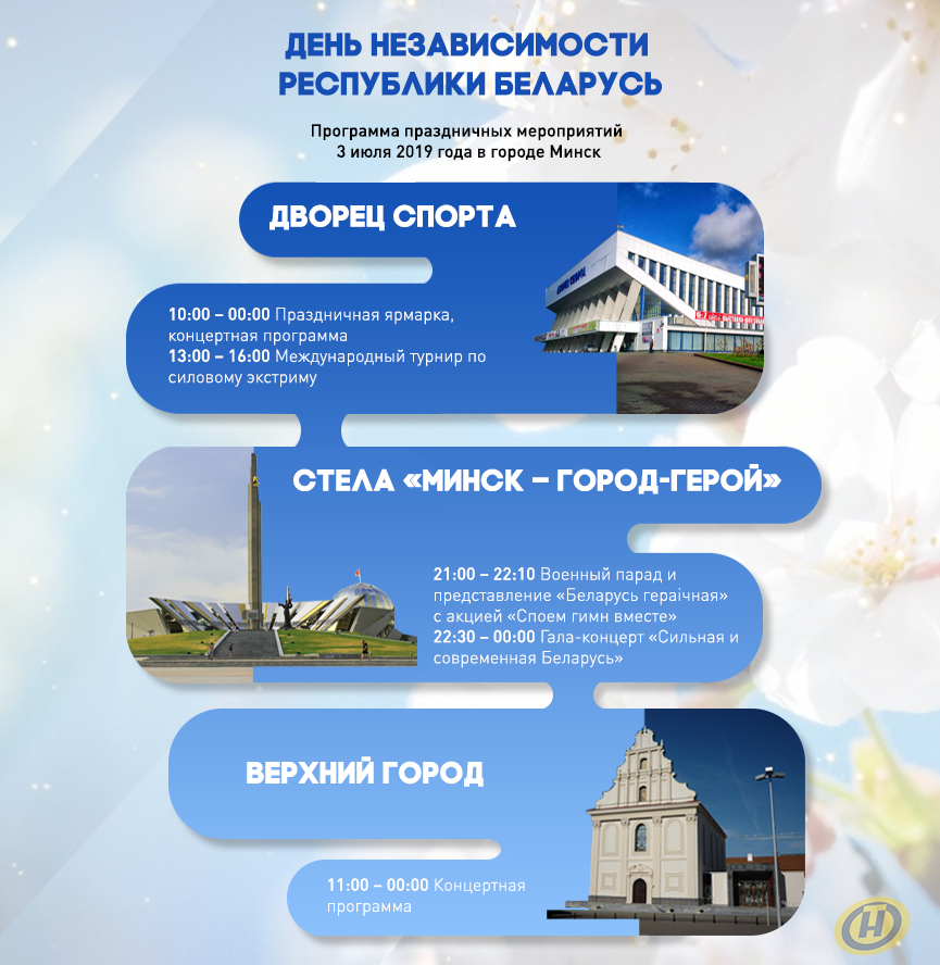Впрочем, ограничиваться только одной площадкой не стоит – только в столице их будет почти 20. А ещё по несколько – в каждом областном и районном центре. Праздничная программа насыщенная. Все города украсили флаги, тематические плакаты, живые панно из цветов – атрибутика в национальном колорите! Военный парад в Минске в этом году пройдет вечером – начало в 21.00.