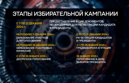 Это можно сделать до 21 декабря. 22 декабря стартует регистрация кандидатов в Президенты. В это же время будут сформированы участки для голосования и участковые избиркомы. Еще один важный этап – агитация – начнется 1 января и завершится накануне основного дня голосования. Сделать свой выбор досрочно можно с 21 по 25 января. Выборы – 26 января 2025 года.