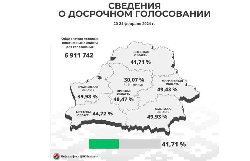 В эту субботу завершился очередной день досрочного голосования. По состоянию на 24 февраля 2024 года в Беларуси в выборах депутатов уже приняли участие 41,71% избирателей.