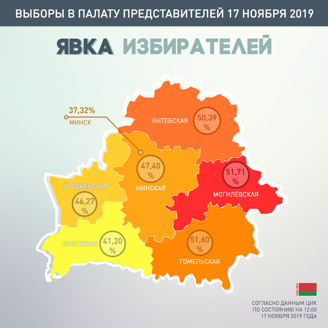 В трех областях Беларуси явка избирателей на выборах по данным на 12.00 превысила 50%. В Витебском, Гомельском и Могилевском регионах – 50,39%, 51,60% и 51,71% соответственно. Явка по стране в целом составила 46,06%.