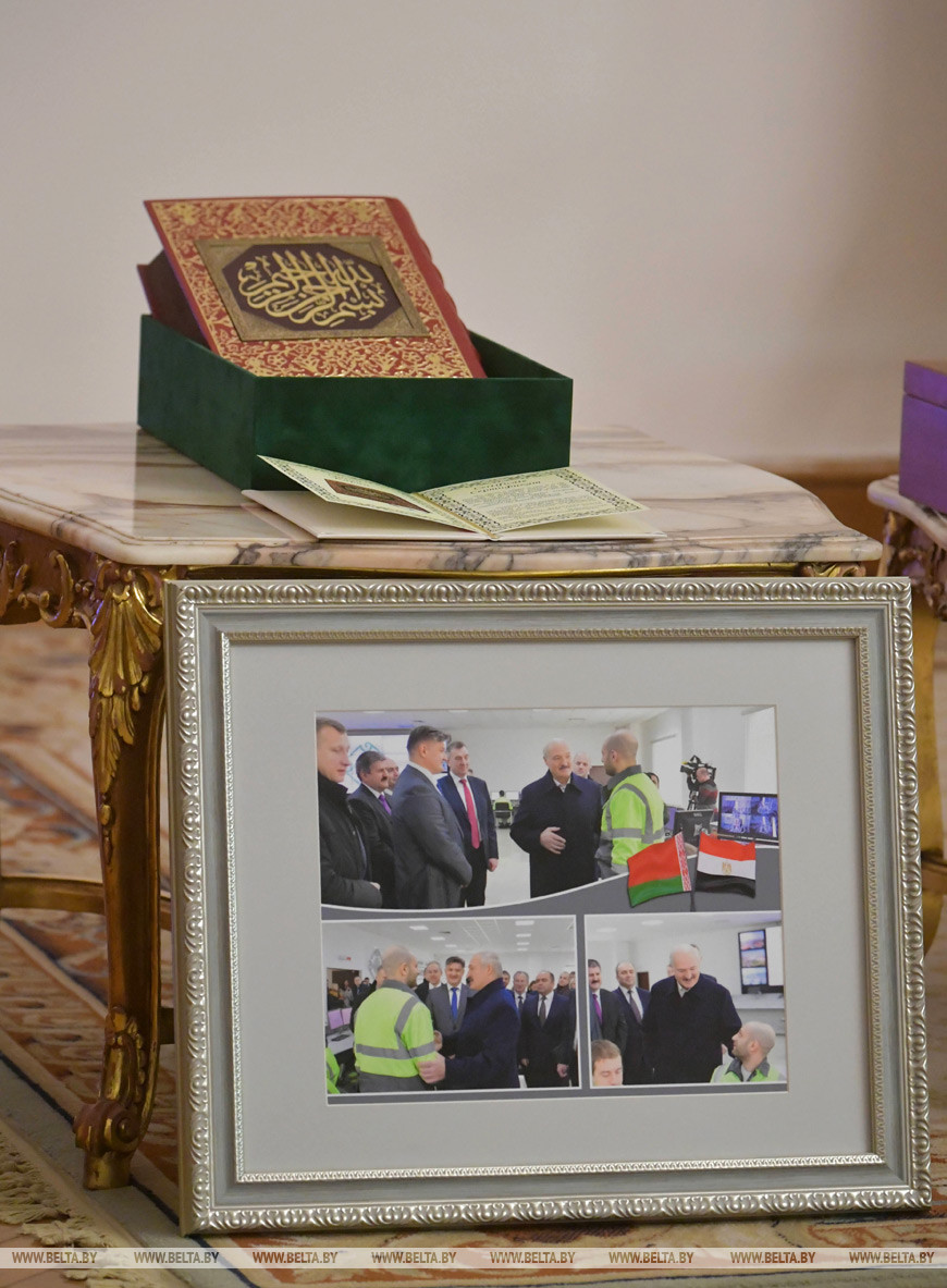 Президент Беларуси получил от Абделя Фаттаха ас-Сиси египетский меч. Как пояснили Главе Беларуси, рукоятка меча сделана из редкого африканского дерева и инкрустирована медью. В свою очередь, Александр Лукашенко подарил главе Египта Коран.