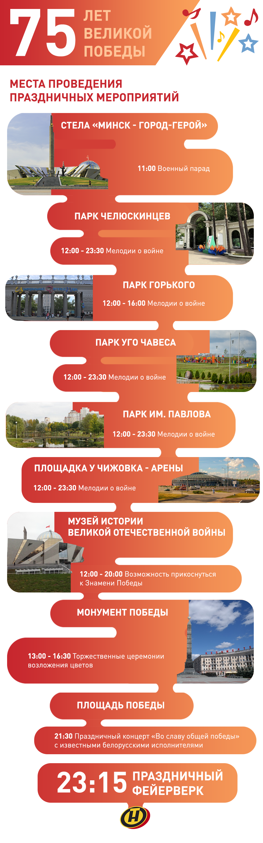 Торжества начнутся военным парадом у стелы «Минск - город-герой» в 11.00. В этом году на параде будут показаны образцы только новой и модернизированной военной техники. Участвовать будут 185 единиц техники и более трех тысяч военнослужащих. Также жители столицы увидят в небе 42 воздушных судна.