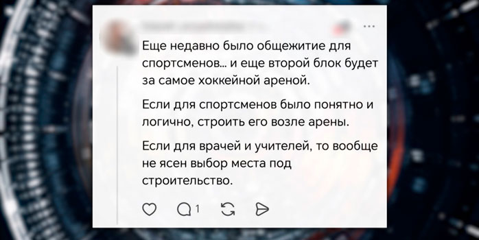 В домовых чатах обсуждают только одну новость. Грядет строительство сразу трех общежитий. И как оказывается – рьяных противников этому немало, которые в один голос заявляют об ущемлении своих прав. На территории появятся не очередные элитные апартаменты с охраной, а социальные дома. Доводы? Мол, покупали жилье за немалые деньги и учитывали генплан развития района. А сейчас что? Лучше бы власти развивали инфраструктуру, строили детские сады и школы.