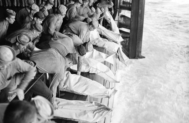 Похороны 65 матросов, которые погибли на авианосце Intrepid в ноябре 1944 года после атаки японских камикадзе. Фотографию рассекретили в начале 21 века. Она была опубликована на страницах исторического журнала.