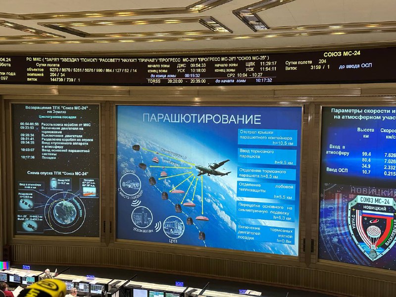«Есть включение. Двигатели работают штатно. Космический корабль "Союз МС-24" переведен на расчетную траекторию спуска», – объявили по громкой связи в Центре управления полетами «Роскосмоса».