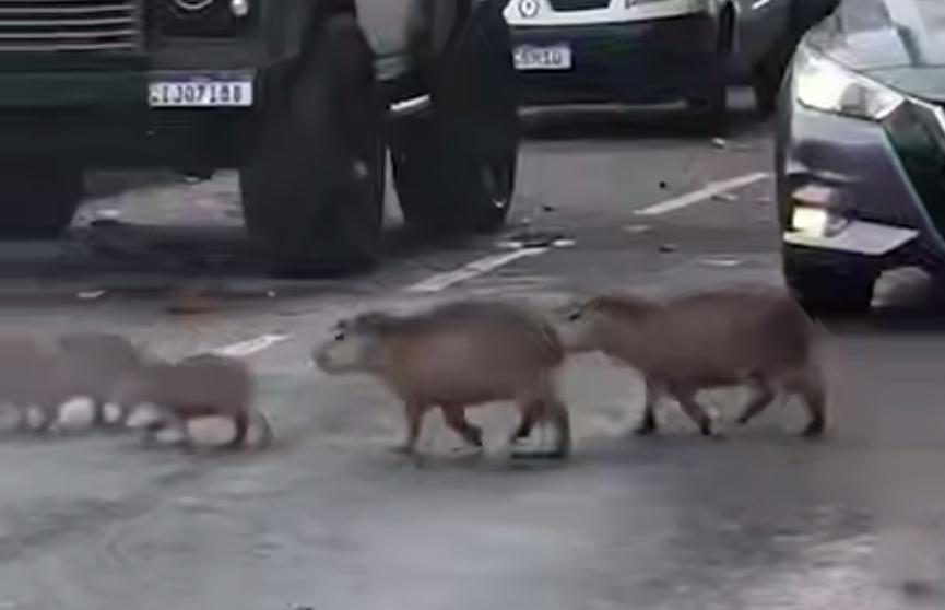 Милый затор: капибары в Бразилии парализовали движение, переходя улицу