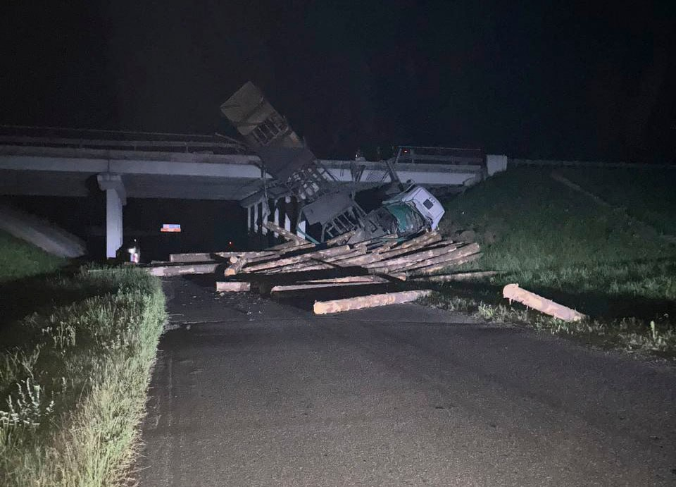 Разорвало шину. Лесовоз упал с моста в Могилевском районе