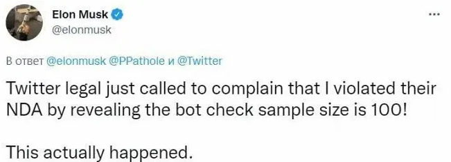 «Мне только что позвонил представитель Twitter, чтобы обвинить меня в нарушении соглашения о неразглашении из-за проверки 100 аккаунтов на ботов! Это на самом деле произошло», – написал он.