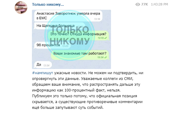 Сегодня, 6 октября, Telegram-канал «Только никому» опубликовал переписку, в которой говорится о том, что Анастасия Заворотнюк умерла вчера, 5 октября, и что точность информации – 98%, а рассказали об этом якобы сотрудники клиники.